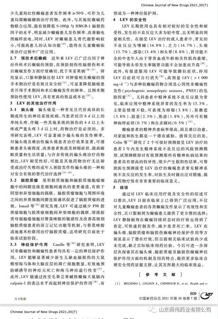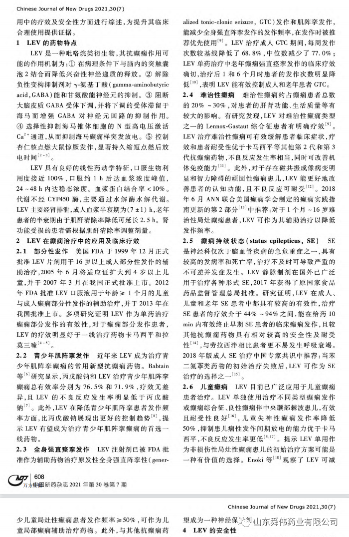左乙拉西坦(1evetiracetam,LEV)是第2代新型抗癲癇藥物,具有抗癲癇譜廣、不良反應(yīng)少、耐受性好和安全性高等優(yōu)點(diǎn),說明書推薦適應(yīng)證為控制癲癇部分性發(fā)作。越來越多的臨床證據(jù)顯示其對癲癇全身強(qiáng)直痙攣發(fā)作、肌陣攣發(fā)作、難治性癲癇、癲癇持續(xù)狀態(tài)等方面也有較好療效,給癲癇的臨床治療提供了更多選擇;且在偏頭痛的替代治療、腦膠質(zhì)瘤及神經(jīng)保護(hù)方面也具有一定潛力。本文結(jié)合近5年來左乙拉西